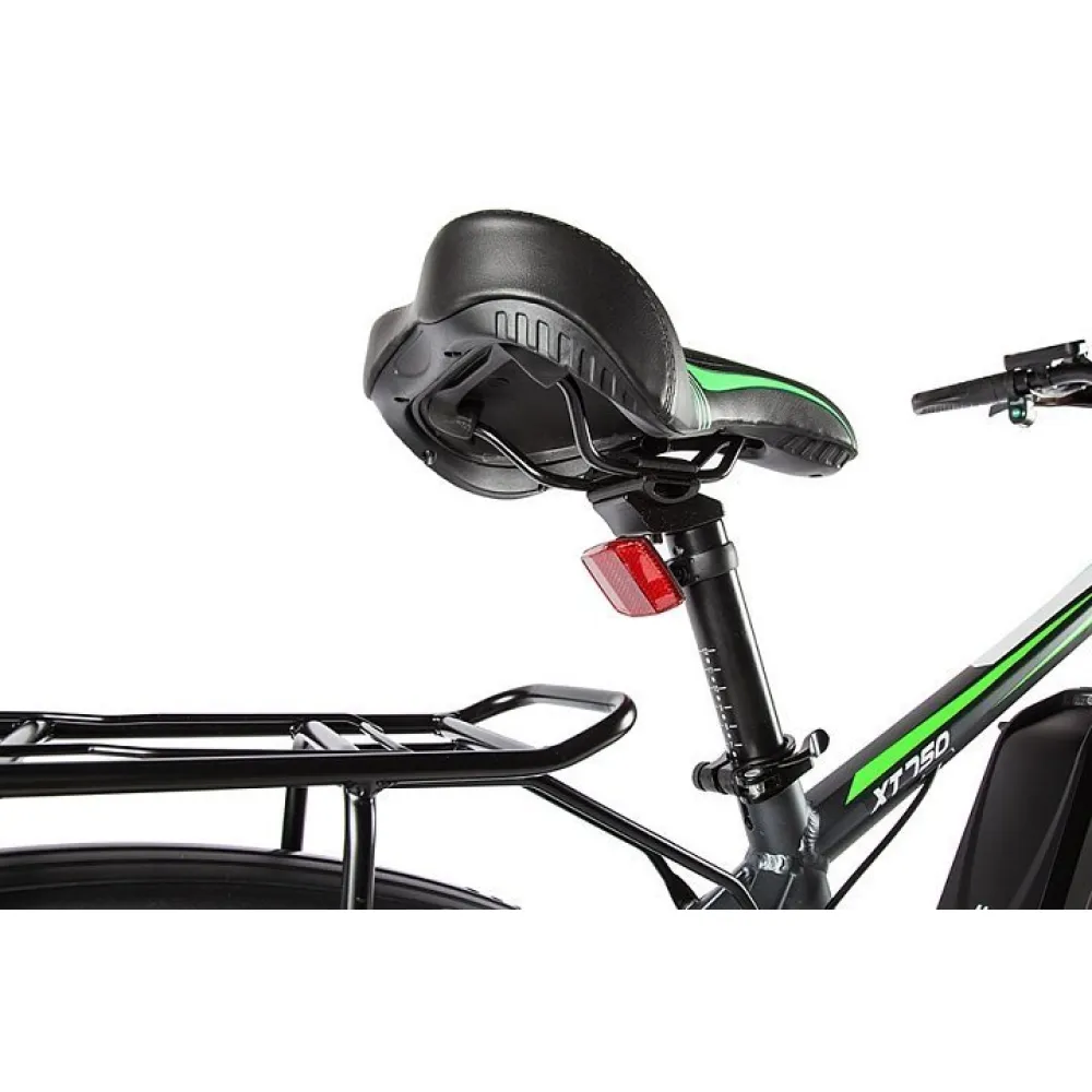 Велогибрид Eltreco XT 750 представляет собой доработанную и улучшенную версию модели ХТ 700. Производители оснастили велосипед  более емким аккумулятором, который обеспечивает запас хода до 50 километров на одном заряде батареи. Расположен аккумулятор под рамой и легко снимается для подзарядки в домашних условиях или офисе. Компактный, но мощный двигатель позволяет развивать скорость до 35 км/час. Такие показатели гарантируют комфортное и мобильное передвижение по городу в течение всего дня. В темное время суток безопасность поездки обеспечивает яркая передняя фара, которая уверенно освещает путь и делает велогибрид заметным для других участников движения. Надежные тормозные колодки с износостойким керамическим покрытием способны быстро остановить транспортное средство даже в экстренной ситуации. Рама выполнена из легкого и прочного алюминиевого сплава и выдерживает нагрузку до 100 килограммов. Пользователи оценят эргономичное сиденье из искусственной кожи и удобные ручки руля, обеспечивающие комфортное положение рук. Велогибрид Eltreco XT 750 отличается стильным и современным дизайном, а его эксплуатационные характеристики позволяют одинаково эффективно использовать его как для поездок по городу, так и для увлекательных загородных велопрогулок.